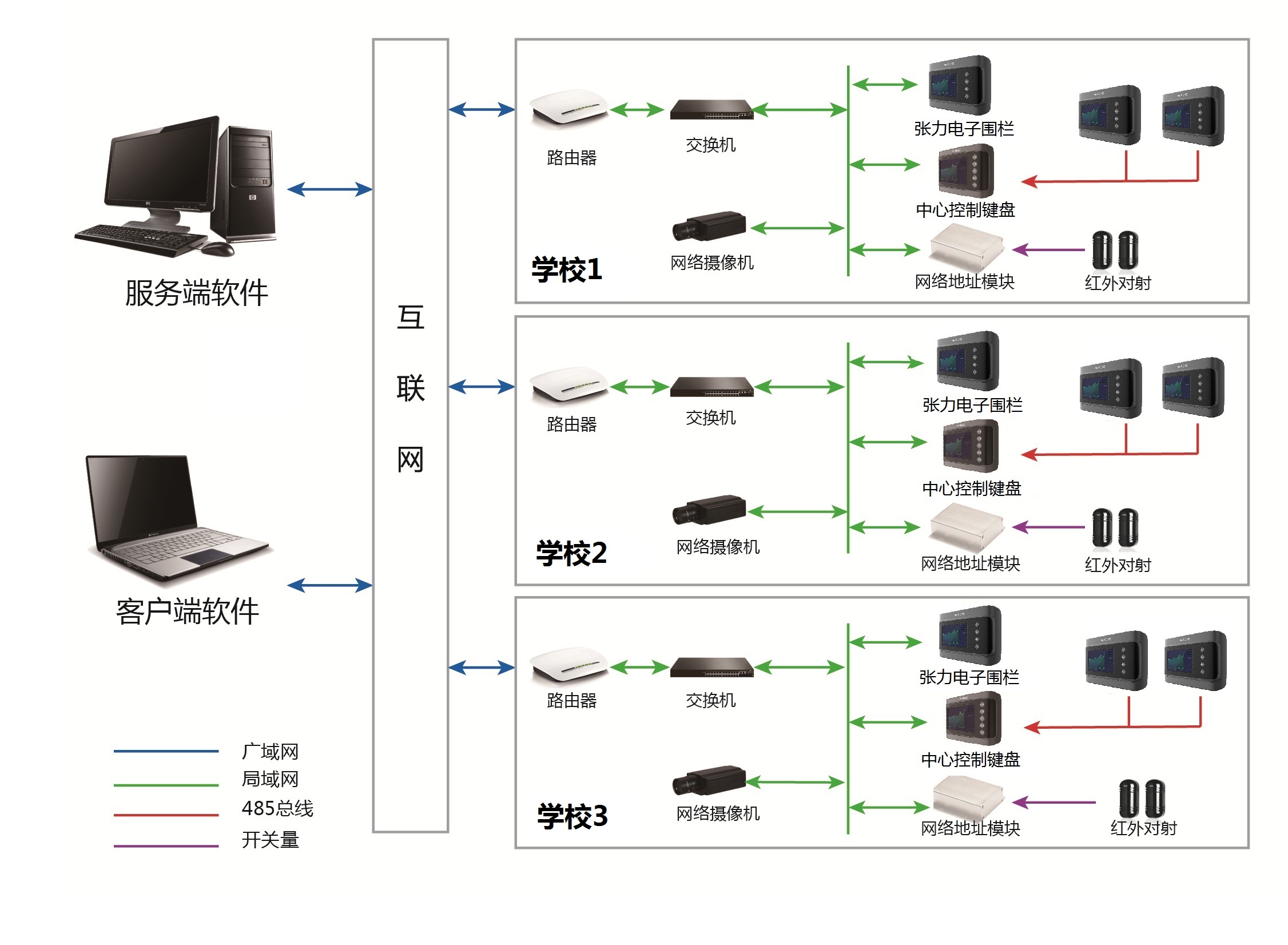 普通高中、中小學(xué)、幼兒園周界距離不長(zhǎng),(常規(guī)采用張力圍欄系統(tǒng))采用RS485總線,將張力圍欄主機(jī)接入中心控制鍵盤,在通過(guò)網(wǎng)絡(luò)單機(jī)控制軟件SW3500進(jìn)行管理。