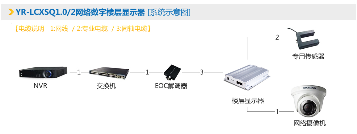 電梯隨行電纜傳輸距離超過75米或使用同軸線,應(yīng)選用YR-LCXSQ-1.0/2型號樓層顯示器,電梯網(wǎng)絡(luò)半球攝像機通過網(wǎng)線接入樓層顯示器,樓層顯示器內(nèi)置EOC編碼器,由樓層顯示器的同軸接口,通過同軸電纜進入后端的EOC解調(diào)器,后端EOC解調(diào)器再轉(zhuǎn)出網(wǎng)絡(luò)信號接入后端交換機進入NVR。