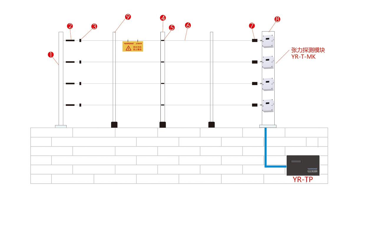 3.適用范圍:四道張力圍欄安裝后,部分圍墻的柱頭與鐵柵欄有小范圍落差造成四道張力式電子圍欄最底下一道鋼絲與鐵柵欄距離大于150mm時,應(yīng)加裝一道或多道張力圍欄對下面的結(jié)構(gòu)進(jìn)行補(bǔ)差;能與上面四道控制桿級聯(lián)統(tǒng)一在一個防區(qū);